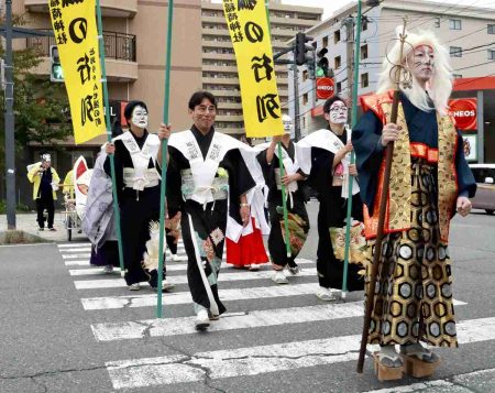 AKITA — An event in which people disguised themselves as foxes using masks or makeup and marched ...