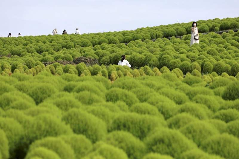 Kochia bushes carpet a hill at Hitachi Seaside Park in Hitachinaka, Ibaraki Prefecture, transforming the scene into a sea of green ripples. The park’s Miharashi Hill is covered in about 33,000 kochia, which is also known as burning bush as the shrub turns red in autumn. “Their fluffy silhouettes are pretty. It was nice to walk through the sea of green,” a 24-year-old visitor said.