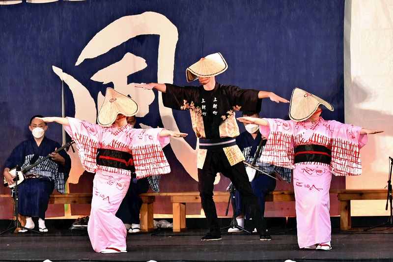 A traditional three day festival where people dance to pray for a plentiful harvest began in the city of Toyama on Thursday. The Owara Kaze no Bon festival was held for the first time since 2019. The festival is known for the Machinagashi parade of dancers that are accompanied by musicians playing “Etchu Owara-bushi” on shamisen and other instruments, but was canceled Thursday due to rain. Tourists were captivated by dancers on a specially made stage wearing braided straw hats hanging low over their heads and gracefully moving their hands.