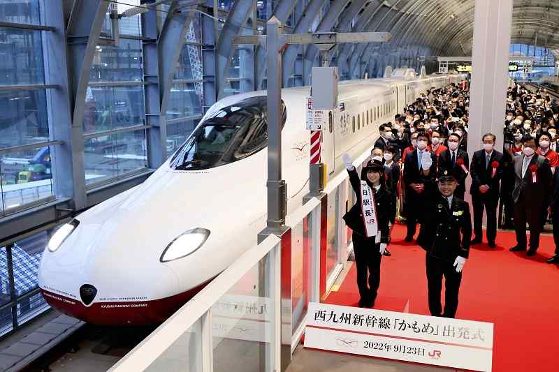 A Kamome (Seagull) Shinkansen train departs from JR Nagasaki Station a little after 6 a.m. on Friday. The train’s trip marked the opening of the 66-kilometer-long Nishi-Kyushu line connecting Nagasaki and Takeo Onsen Station in Takeo City, Saga Prefecture. A local express train and the new Shinkansen will carry riders between Hakata Station in Fukuoka City and Nagasaki Station in as little as 1 hour 20 minutes, cutting journey times by about 30 minutes.