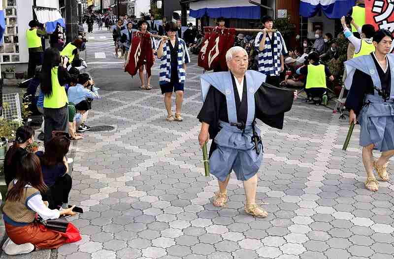 NIIMI, Okayama — People along a street in the center of Niimi, Okayama Prefecture, went down on their knees as a portable shrine was carried past with an armed escort.