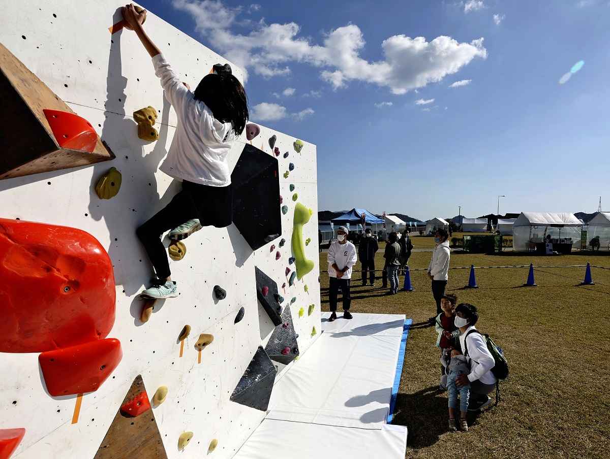 Hideyuki Okamoto, a 43-year-old movie producer from the city, launched an initiative in 2018 to hold such events once or twice a year in an effort to revitalize the area. During the event, a bouldering class was offered using an artificial wall, where children tried their hand at the sport.