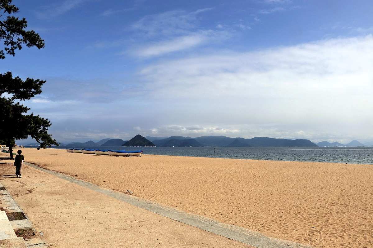 This is the largest beach in Okayama Prefecture, boasting a coastline of white sand and green pines. It has been selected as one of the 100 best beaches in Japan, and also attracts many tourists for marine sports, such as sailing and windsurfing. The beach was closed to the public in 2020 and 2021 due to the novel coronavirus pandemic, but was reopened in the summer of 2022.