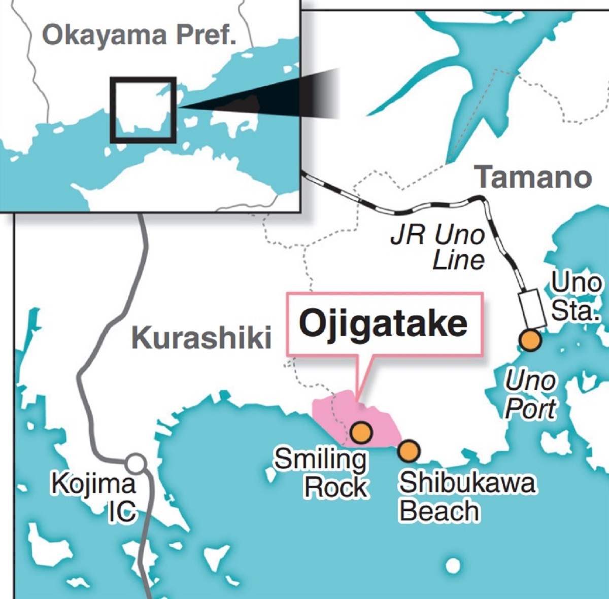To get to Mt. Ojigatake, take an express bus from JR Uno Station or Okayama Station and get off at the Shibukawa stop. From there, it is about a 10-minute ride by taxi, or about a 60-minute walk. By car, it takes about 20 minutes from the Kojima Interchange on the Seto-Chuo Expressway. A free parking lot for about 200 cars is located near the mountain’s summit.