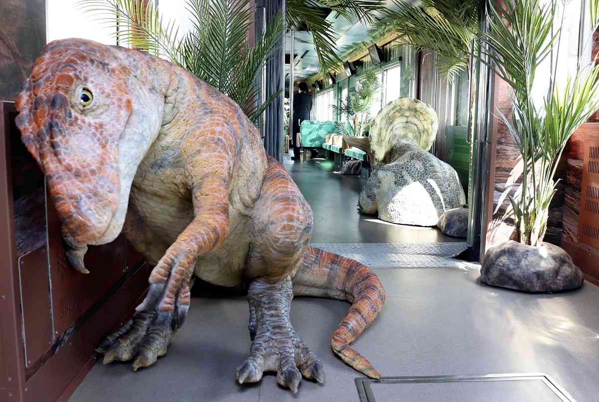 A miniature replica of a Fukuiraptor is displayed in a train car in Fukui.