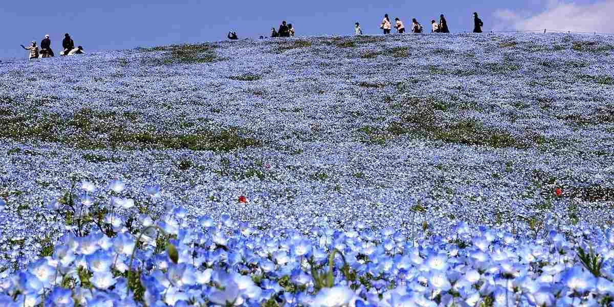 Blue nemophila flowers have reached peak bloom at Hitachi Seaside Park in Hitachinaka, Ibaraki Prefecture. Native to North America, the annual flowers have blooms with a diameter of about 3 centimeters. Around 5.3 million nemophila flowers dot Miharashi no Oka Hill within the park. The blossoms will be at their peak until around Saturday, according to the park. “It’s beautiful as it looks like a crystal blue lake,” said Naomi Koda, who visited on Monday with her husband and dog from Nagareyama, Chiba Prefecture.