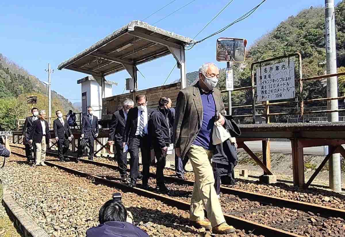 People walk along the tracks of the defunct Sakugiguchi Station in Onan, Shimane Prefecture, on April 1.