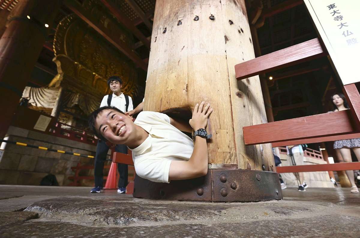 A student squeezes through a hole, which is said to be the size of the Great Buddha’s nostril, at the base of a pillar at Todaiji temple in Nara City on Thursday. The temple allowed visitors to go through the 37-centimeter by 30-centimeter hole for the first time in three years, following a suspension due to the pandemic. A third-year junior high school student from Tokyo was the first person to go through the hole after the suspension. “[The hole] was narrow, but I managed to get through,” he said. “I’ll remember this forever.”