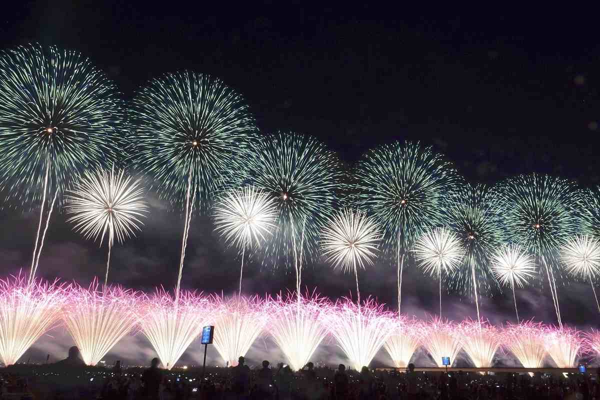 Huge fireworks light up the night sky over Nagaoka, Niigata Prefecture, on Wednesday with the full return of the city’s fireworks festival regarded as one of Japan’s three major ones. The loudest cheers were reserved for the Phoenix Fireworks (shown above), one of the highlights of the show, in which a series of bursts explode over a two-kilometer range. The Phoenix were created as a prayer for recovery from the Niigata Prefecture Chuetsu Earthquake that struck the area in 2004. The festival was held on a full scale for the first time in four years, without restrictions on eating and drinking. The fireworks will be held tonight.