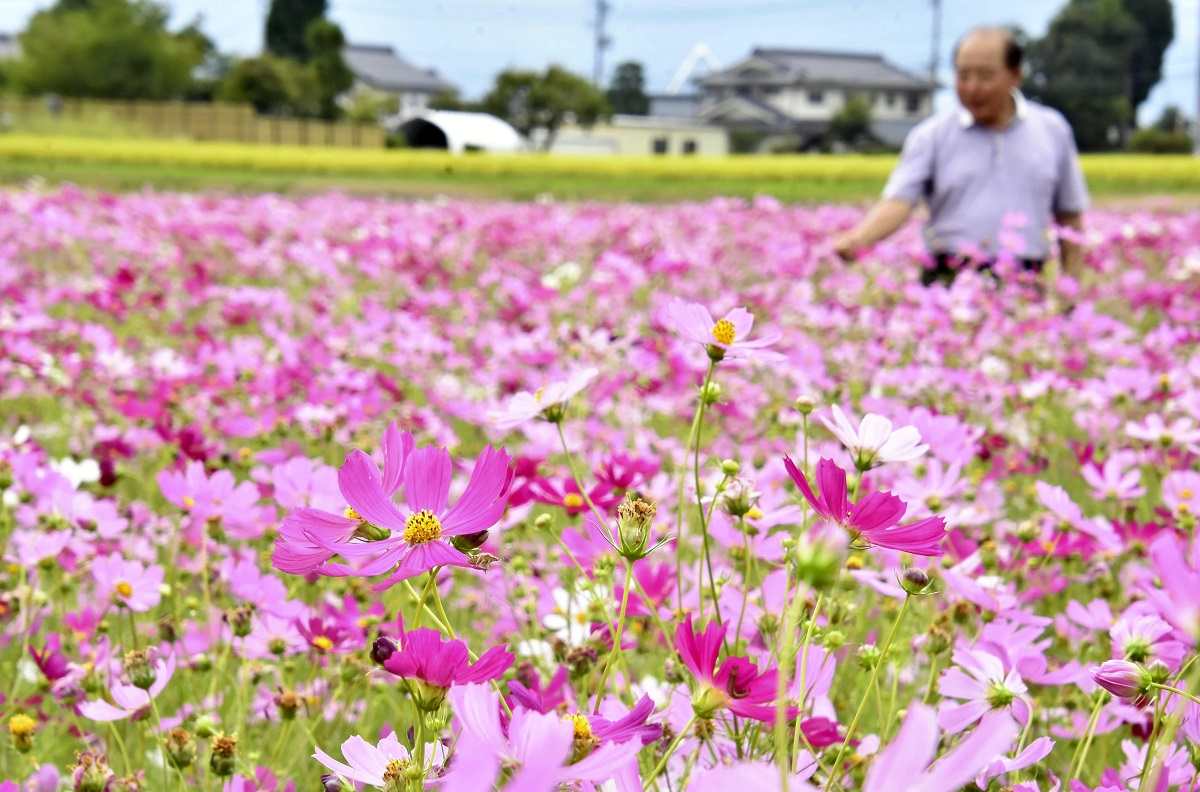 Cosmos are in bloom in a former barley field in Matsumoto, Nagano Prefecture. A local community group launched an initiative to grow cosmos to promote more interaction between residents. In July, the group planted the seeds with Matsumoto University students and others in the 3,300-square-meter field after the wheat harvest. “We hope this will become a place where people can relax while looking at the flowers and feel at home,” the 73-year-old head of the group said. The flowers are expected to stick around through late September.