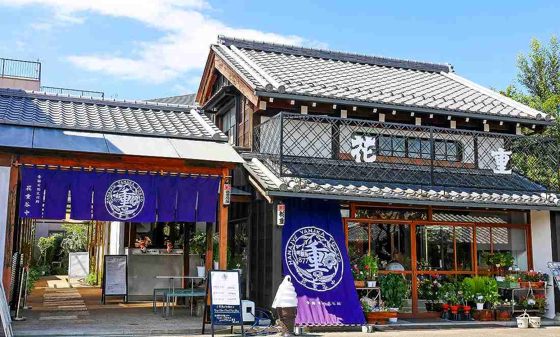 The building on the right is the Meiji wing built in 1877. To the left is the Nagaya wing, which was once used as a workspace for the flower shop. Visitors can pass through its noren curtains and enter the cafe.