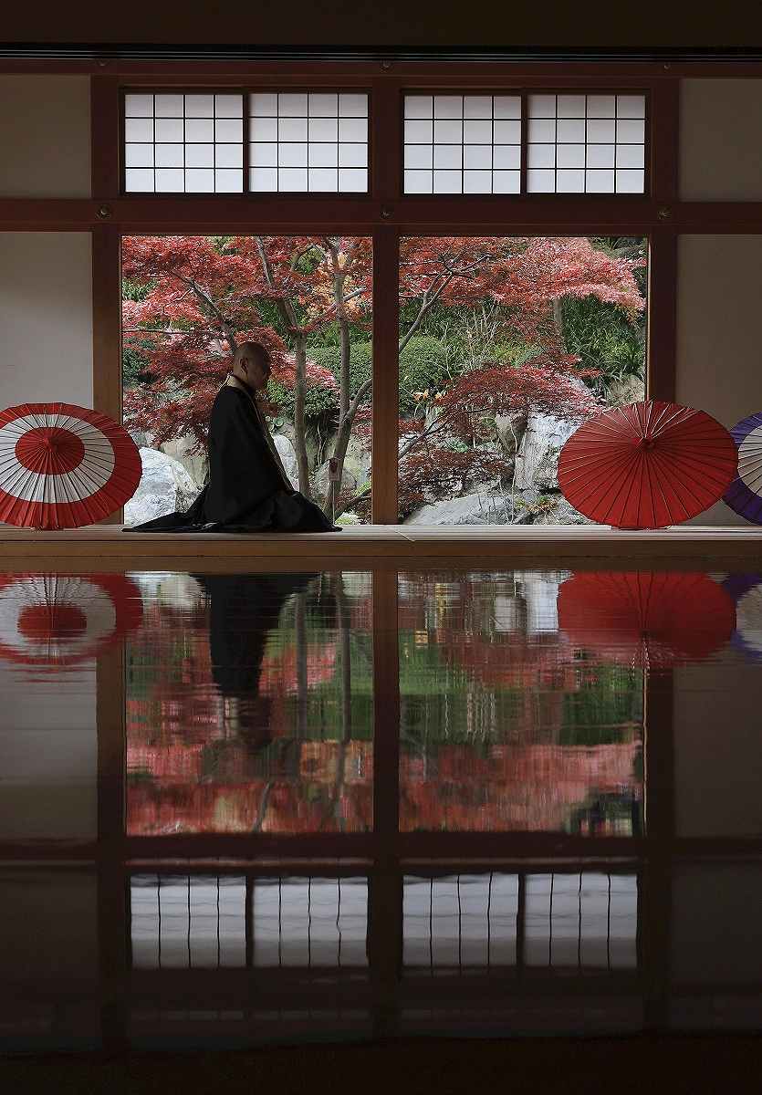 Leaves of more than 100 maple trees have turned bright red at Houtokuji, reflecting on the lacquered floor of the temple’s main hall in what is called yuka-momiji, which means “autumn leaves on the floor.”