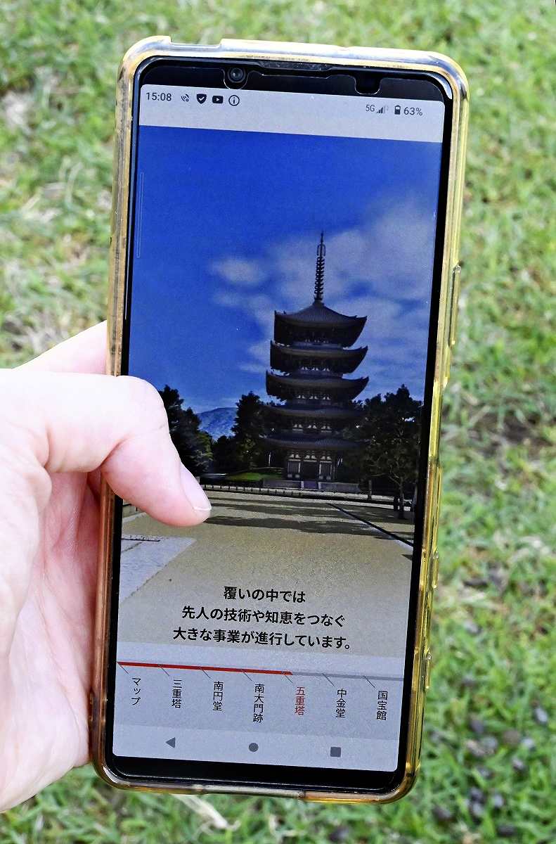The service is available in Japanese and English. Tourists from Japan and abroad are already touring the temple grounds with their smartphones in hand, comparing the actual scenery with the VR images. A 55-year-old male office worker from Yokkaichi, Mie Prefecture, said: “The guide is easy to view and understand. I also got to see the pagoda even though it’s currently under construction.”