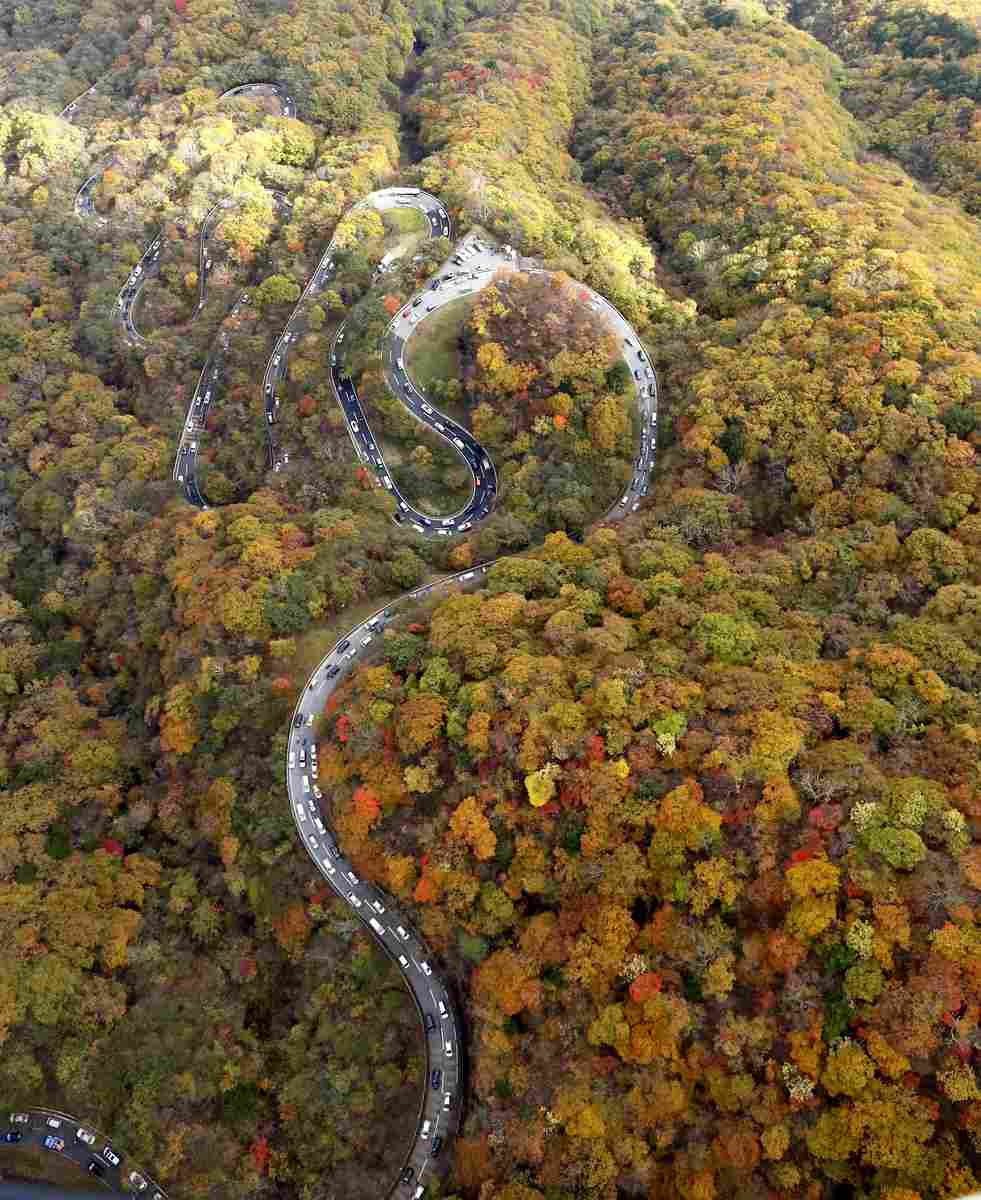 Autumnal leaves fill the trees along Irohazaka sloping road in Nikko, Tochigi Prefecture. Red and yellow leaves of maple, rowan, azalea and Japanese beech trees bring joy to tourists on the road which connects Lake Chuzenji in the Okunikko area with Nikko.
