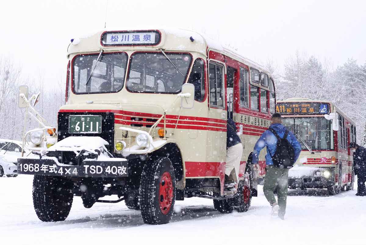 The so-called “bonnet bus” is running three round trips a day between the Morioka Bus Center and Matsukawa Onsen until around March. Every winter, Northern Iwate Transportation, headquartered in Morioka, deploys a four-wheel-drive bus that is a 1968 model and has high enough ground clearance to drive on steep, snow-covered roads.