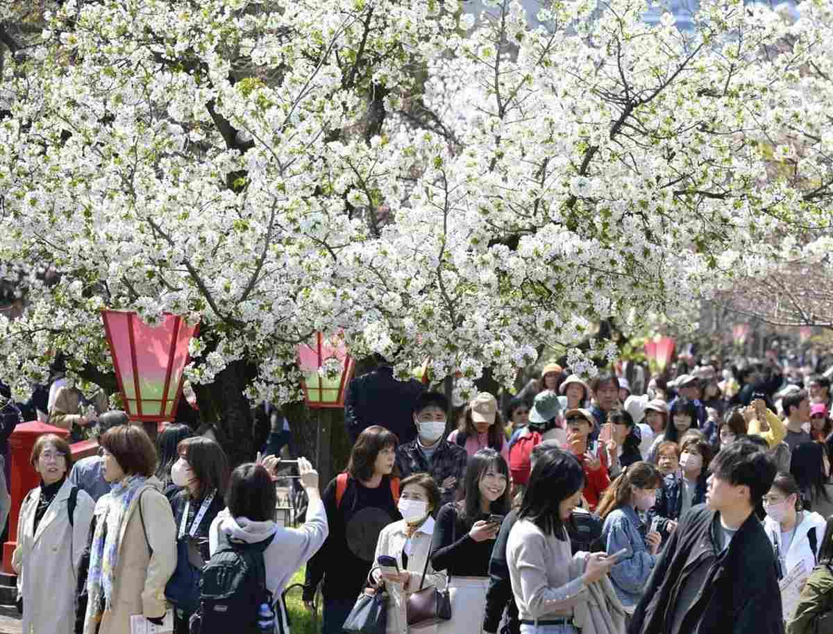 OSAKA — Visitors are enjoying cherry blossom viewing amid warm spring weather as the “Cherry Blossom Tunnel” at the Osaka Mint Bureau in Osaka City opened on Saturday.