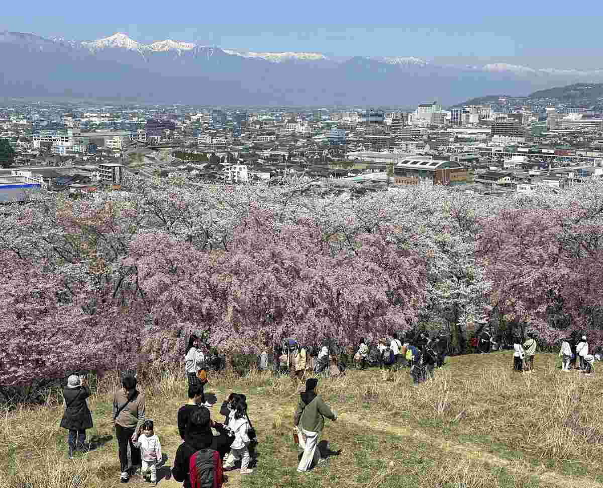 MATSUMOTO, Nagano — About 4,000 cherry trees were seen at their peak on Saturday on an ancient tomb against a view of the snow-capped Northern Alps in Matsumoto, Nagano Prefecture.