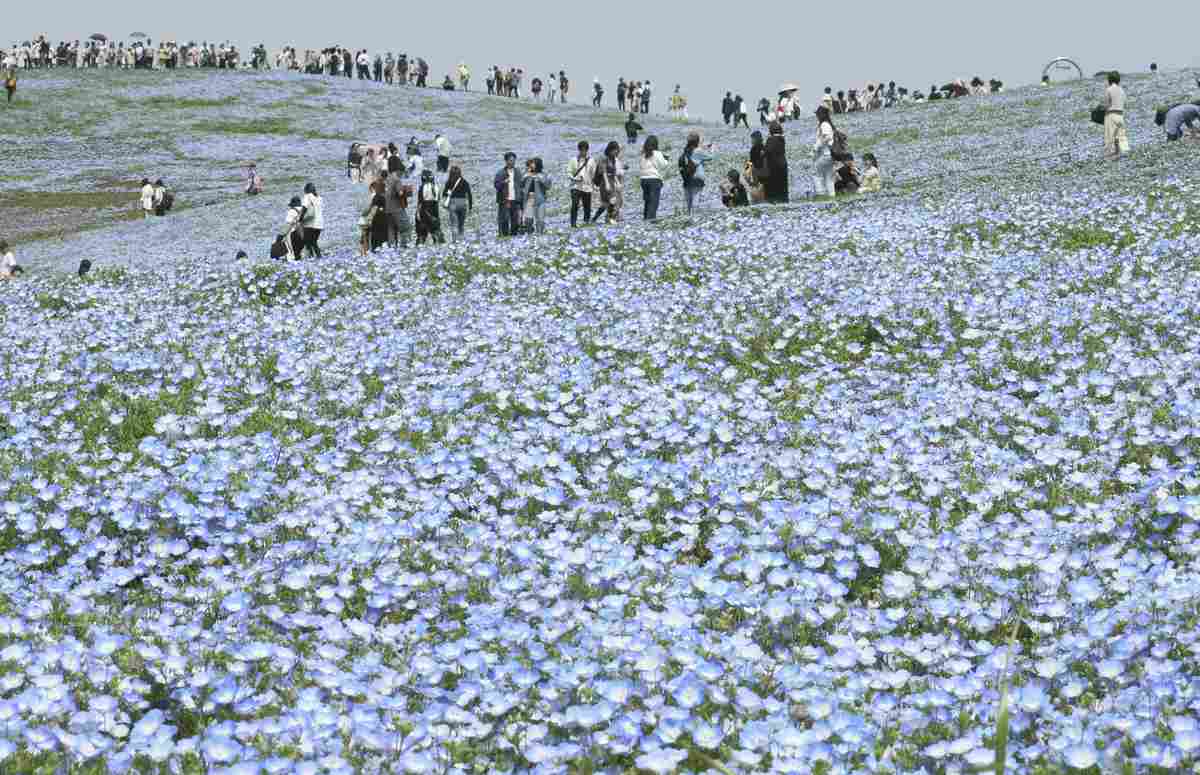 MITO — A carpet of pale blue nemophila flowers has reached peak bloom, delighting visitors to the Hitachi Seaside Park in Hitachinaka, Ibaraki Prefecture.