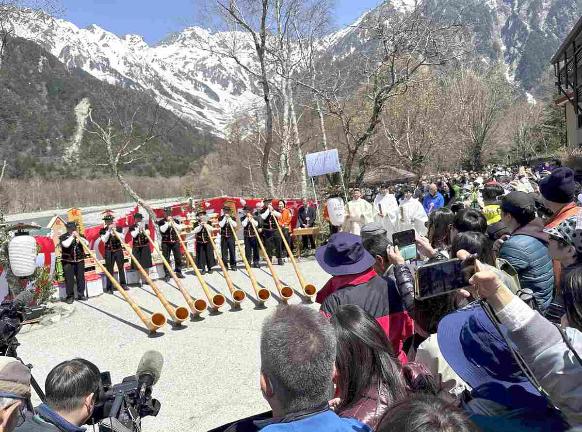A ceremony marking the start of tourist season at the Kamikochi highlands was held in Matsumoto, Nagano Prefecture, on Sunday. Climbers and sightseers prayed for safety on the mountains amid the sounds of alphorns. This year marked the 55th such ceremony, which was blessed with fine weather, giving clear views of the Hotaka mountain range and Mt. Yakedake.