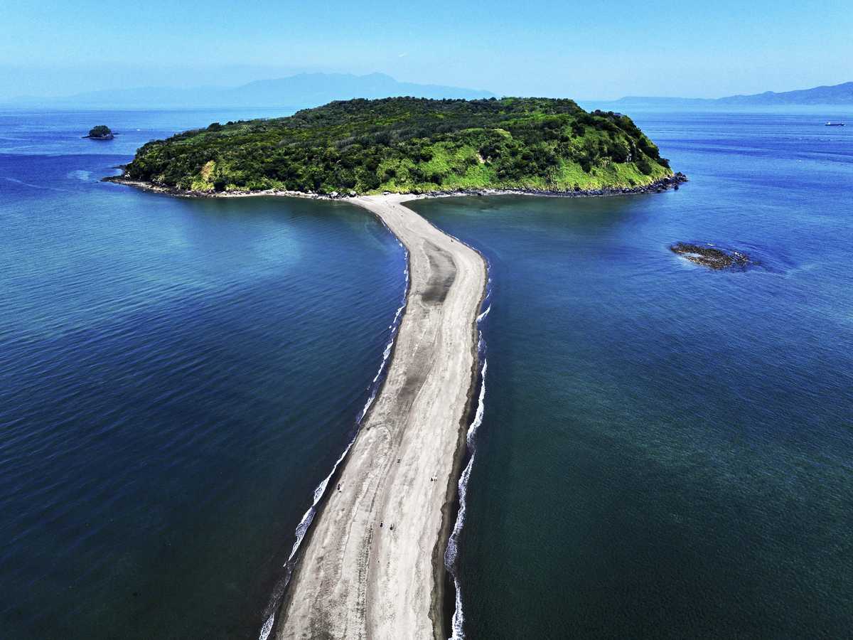 An 800-meter-long sandbar can be observed at Chiringashima Island for several hours a day during low tide from March to October, allowing visitors to walk between the island and the Satsuma Peninsula.