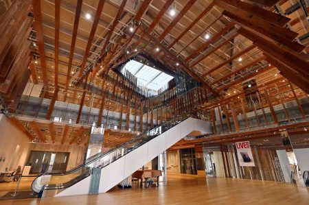 Another highlight is the museum building itself, which was designed by the world-renowned architect Kengo Kuma. The exterior, which combines glass, aluminum and granite, glitters under the sun. Inside, visitors are greeted by an expansive six-story atrium and an interior filled with wood, which together give a spacious and airy ambiance.