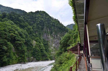 The Kurobe Gorge Railway’s trolley train service is closed from December to mid-April. Unazuki Station is about a five-minute walk from Unazuki Onsen Station on the Toyama Chihou Railway Line. It is 13 kilometers away from the Kurobe Interchange on the Hokuriku Expressway.