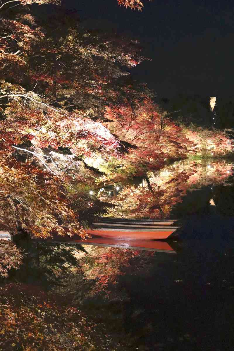 Illuminated autumn leaves reflect on the moat surface of Hirosaki Park during the Hirosaki Castle Chrysanthemum and Autumn Foliage Festival in Aomori Prefecture. About 3,700 trees’ leaves turned red and amber yellow, reaching their peak. They will be lit up from 4 p.m. to 9 p.m. through mid-November, while the festival features a 6-meter-tall floral art installation representing Mt. Iwaki, and the arrangement of chrysanthemums and apples floating in a water basin at the castle’s botanical garden, the event’s main venue.