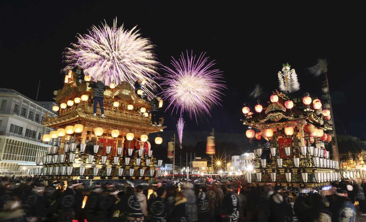 Fireworks erupt in the night sky, illuminating two massive floats hung with lanterns during a crowded festival in Chichibu, Saitama Prefecture. The Chichibu Night Festival was held Wednesday and set off about 4,000 fireworks. An estimated 220,000 spectators attended throughout the day. The festival, which is recognized by UNESCO as intangible cultural heritage, saw six floats, each weighing over 10 tons, gather at Chichibu Shrine at dusk.