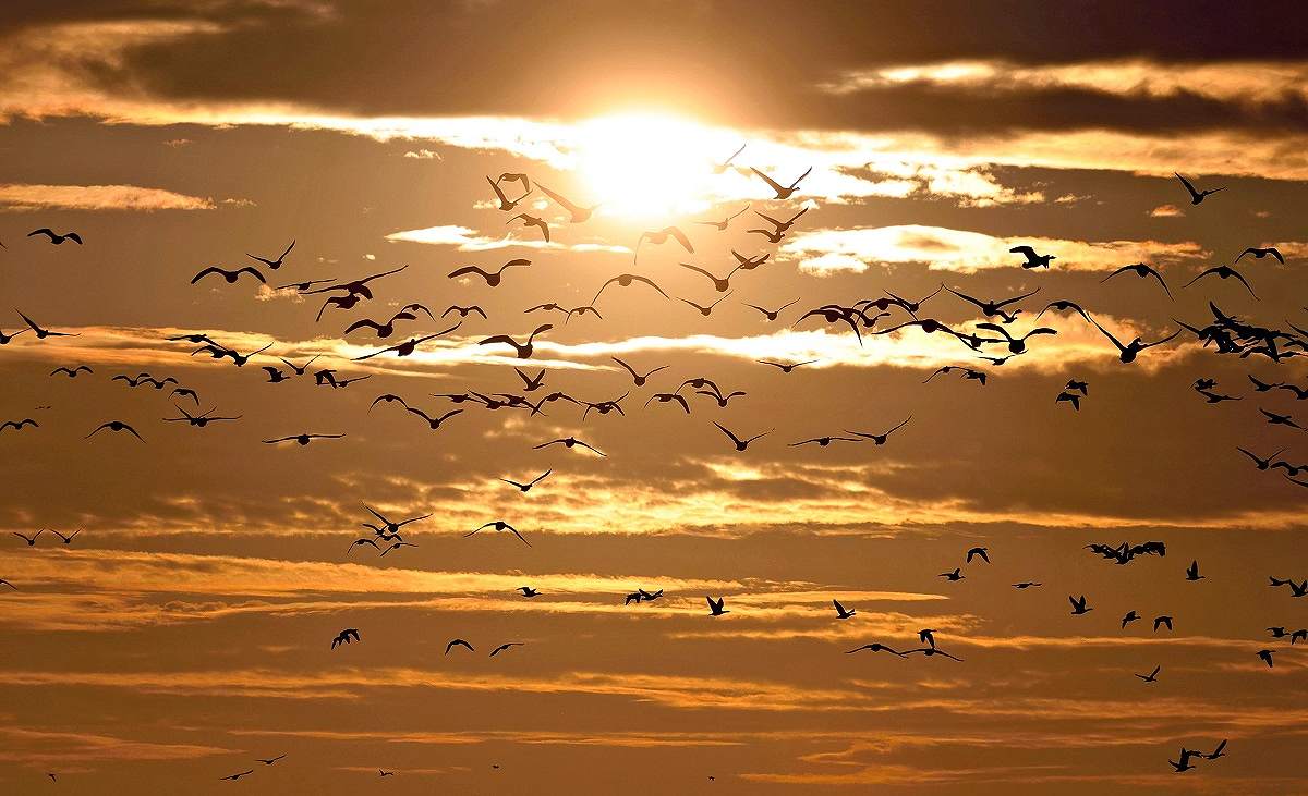 White-fronted geese fly above Izunuma pond, which straddles the cities of Kurihara and Tome in Miyagi Prefecture, in the morning sunshine. The arrival of the geese is now at its peak, with at least 100,000 spotted wintering there this season.