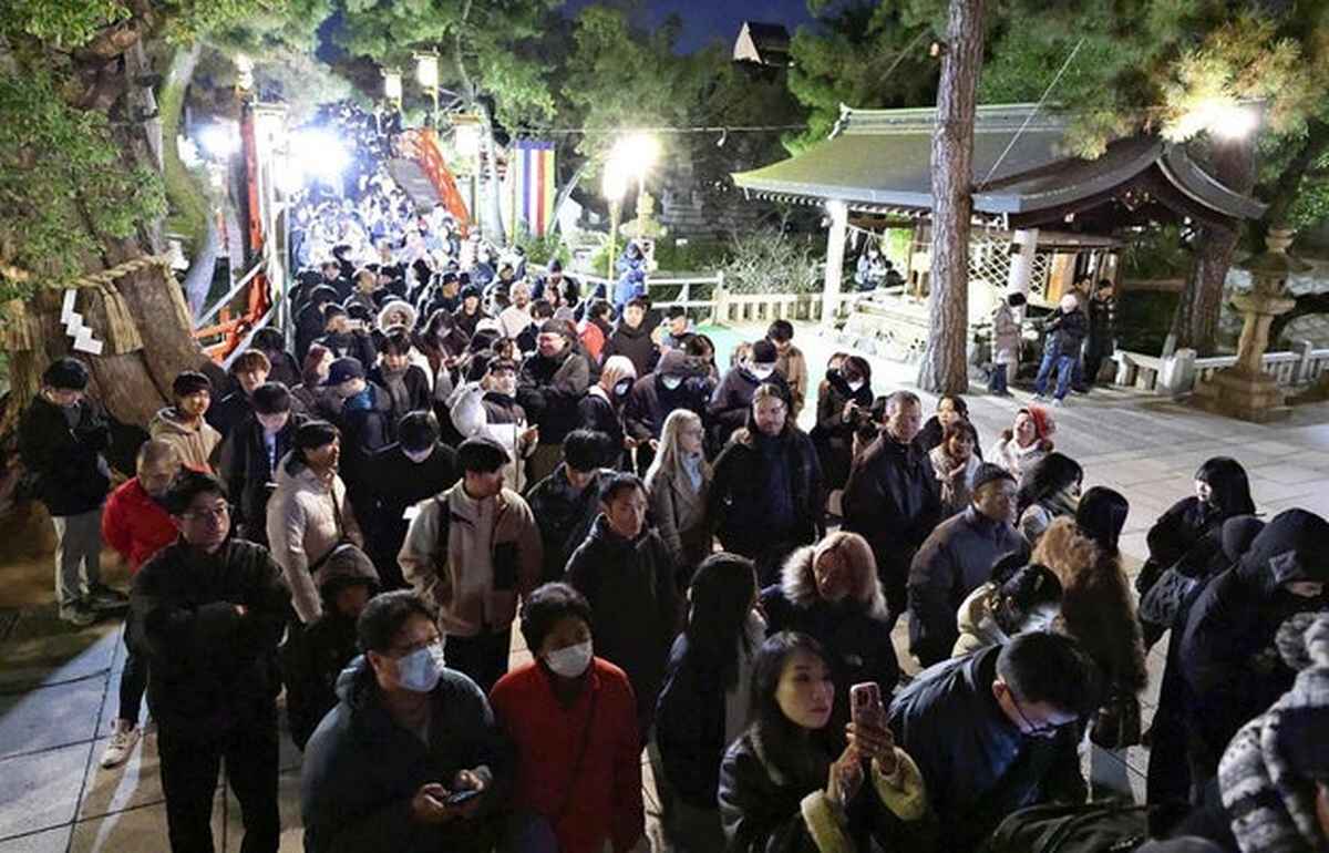 A crowd of worshipers walks through Sumiyoshi Taisha Shrine in Sumiyoshi Ward, Osaka, on Dec. 31.