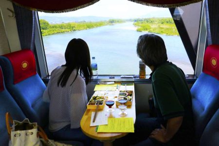 “We want customers to enjoy premium wine and meals while gazing at the tranquil scenery of Shinshu aboard Japan’s slowest limited express train,” said a company official. The train offers views of snow-capped mountains, such as Mt. Iizuna and Mt. Myoko in northern Shinano. It makes brief stops at scenic spots, such as Chikuma River.