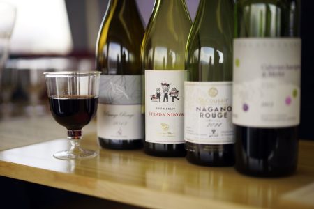Early afternoon, I took the Nagano Electric Railway’s limited express Yukemuri Nonbiri-go to the Yudanaka Onsen hot spring. On Saturdays, national holidays and certain other days, one of the middle cars of the four-car train operates as the Kitashinano Wine Valley Train, allowing passengers to enjoy all-you-can-drink wine that has been carefully selected from wineries in the northern Shinano region.