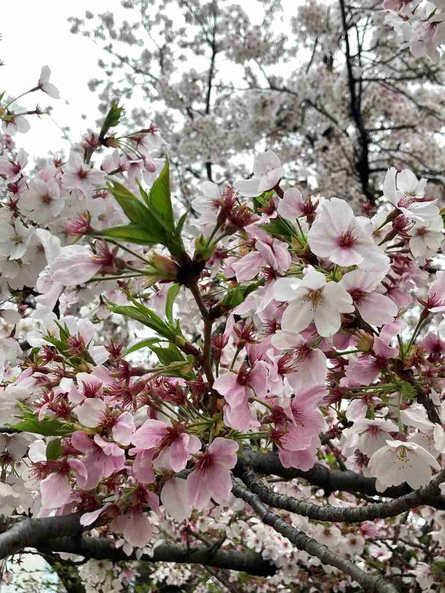 People enjoyed walking along the paths under the pale pink cherry blossoms while taking photos.