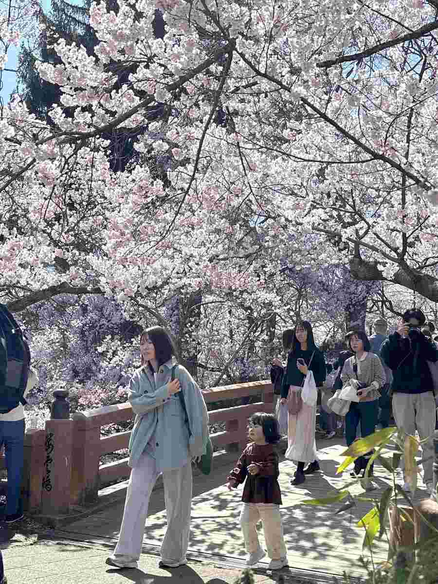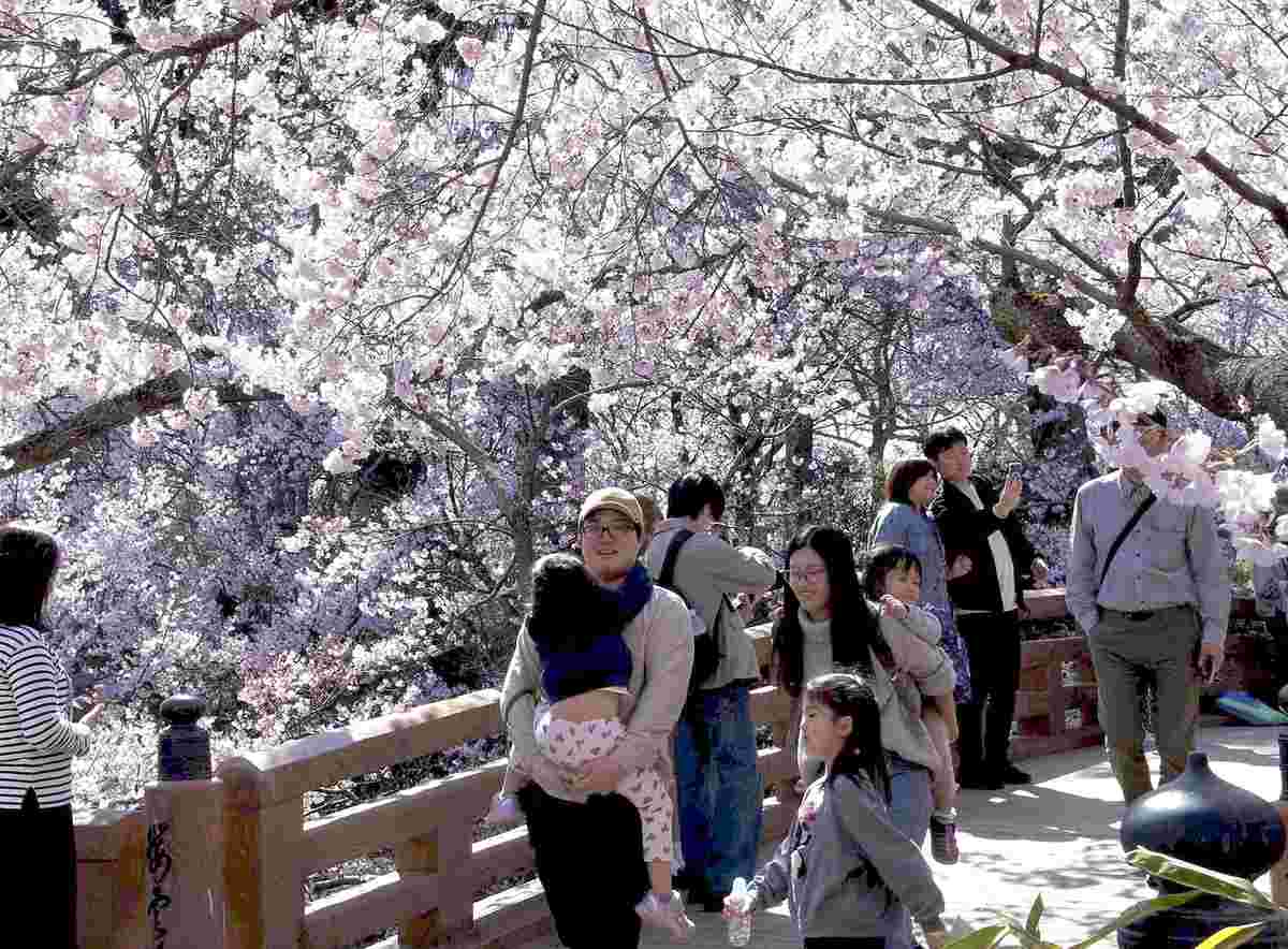 The park’s cherry blossoms reached their peak eight days earlier than last year. Following several days of bad weather since the flowers started blooming on March 28, Friday’s sunny sky brought many visitors to stroll the former castle site.