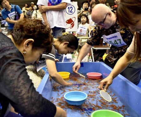 YAMATO-KORIYAMA, Nara — Goldfish swim along the shopping street in Yamatokoriyama, Nara Prefecture, ...