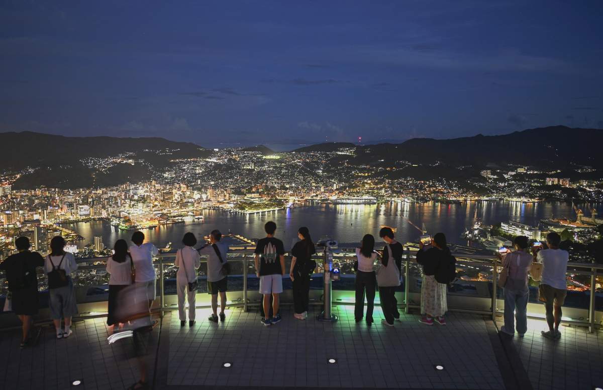 Visitors look out at the cityscape of central Nasaki in October 2025.
