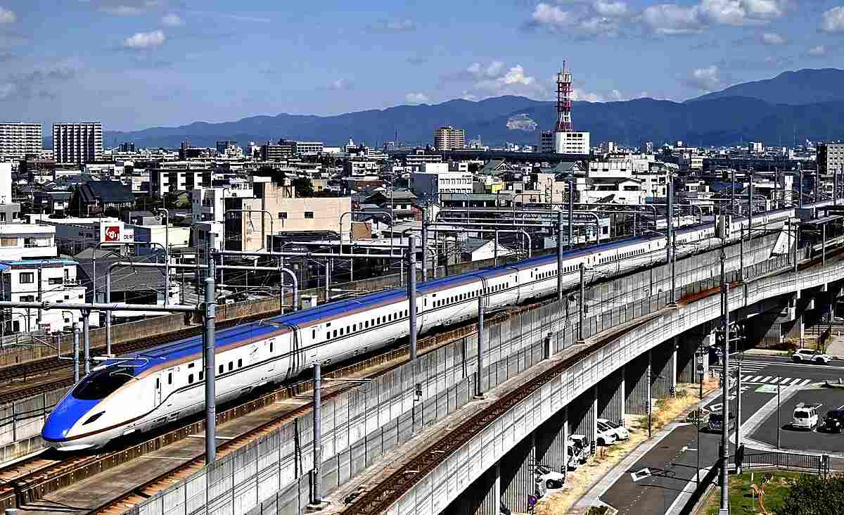 A Hokuriku Shinkansen train runs near Fukui Station in September 2024.