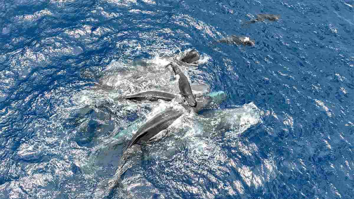 Using drone video, underwater audio and shipboard photography, scientists with the Project CETI research organization documented the event on July 8, 2023. The birth process lasted about 34 minutes, from flukes emerging from the mother to the calf’s delivery.