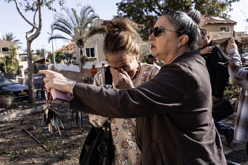 Eti Dahan, 60, cries as she is comforted Sunday by a friend at the site of an Iranian missile strike in Dimona, Israel.