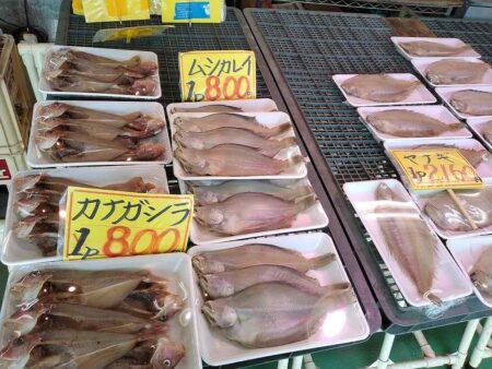 Local flatfish sashimi and fresh mehikari fish, which is delicious when deep-fried, were on sale.