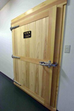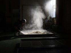 Koji is cooled and dried in the sake storage room. In the past, when refrigeration facilities were not available, koji was dried in a well-ventilated place like this. Nowadays, koji is partially dried with a fan and then stored in a cold storage room. (Courtesy of Senjo)