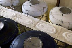 Steamed rice is spread out on a slatted drainboard to cool. The newly steamed rice is too hot to be touched directly. (Courtesy of Senjo)