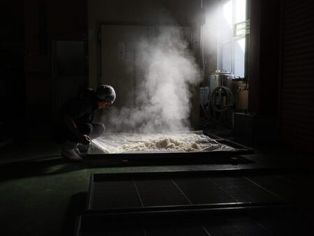 Ironically, Senjo’s industrial-scale facilities posed a prohibitive bottleneck when it came to trying out Kurogochi’s less-is-more approach. Oriented toward mass production, the brewery was routinely converting 6,000 kg of rice into 15,000-liter batches of sake. This was far too many zeros to risk on an experimental batch — failure would mean literally pouring money down the drain.
