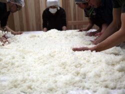 The spread out steamed rice is further mashed and mixed over while it is cooled to the target temperature. (Courtesy of Senjo)