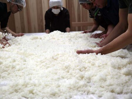 Work in the koji room. After sprinkling koji mold on the steamed rice, the rice is mixed evenly. (Courtesy of Senjo)