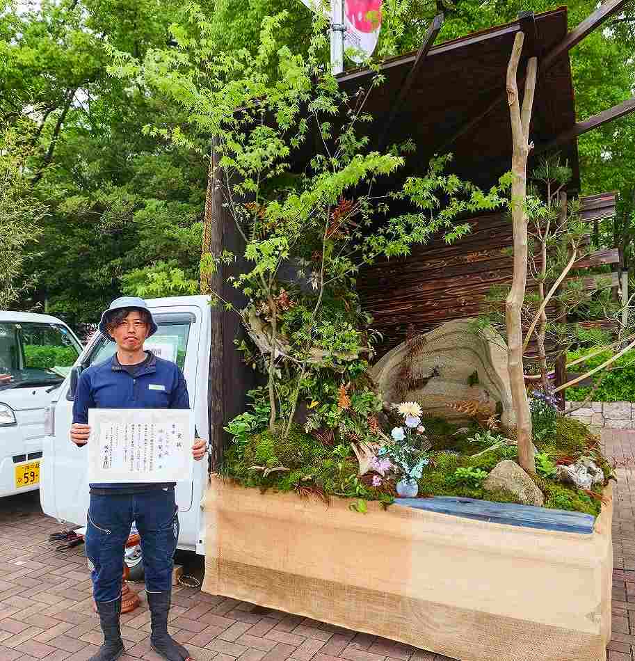 A participant from a company called Niwa ya Haruka in Shiga Prefecture is about to complete a garden landscape on a light truck.