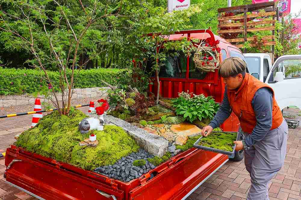 Masayuki Sakaguchi, deputy director general and Kansai bloc leader of the federation, said: “The aim of the Keitora Garden Show is to make young professional gardeners brush up their skills, have them compete in degree of perfection and display the attractiveness of gardening to a wide range of people. As the garden landscapes are on the beds of light trucks instead of the ground, visitors find it easier to see.”