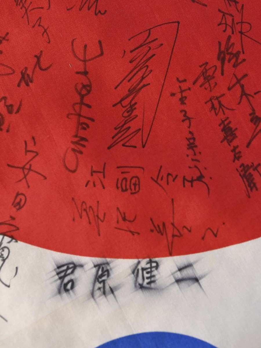 Part of a collection of messages from athletes who participated in the 1964 Tokyo Olympics. The photo shows the name of Kenji Kimihara in the bottom and the signature of Tsuburaya in the upper center.