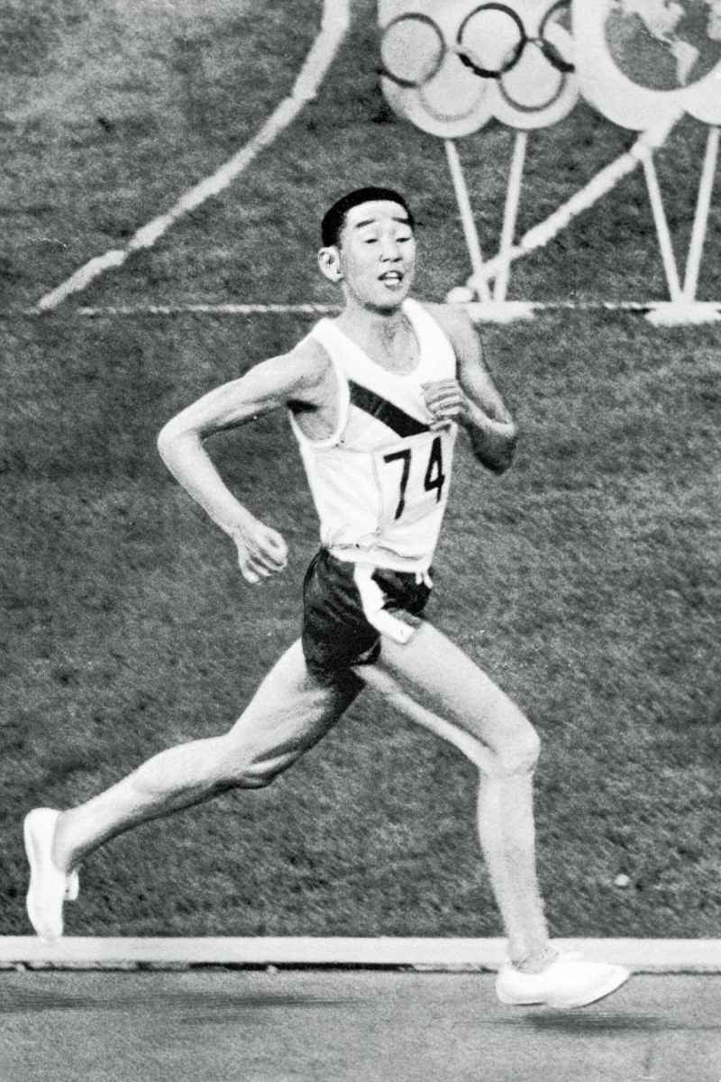 Kenji Kimihara runs on a track at the Olympic Stadium in Mexico City, en route to the silver medal in the 1968 Olympic marathon competition, on Oct. 20, 1968.