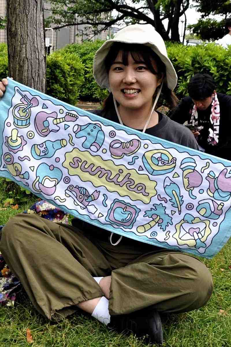 A line stretched out in front of a photo spot, which featured a commemorative backdrop. Some people waited in the line alone, but I gave up on getting a picture there. Mamiko Abe, a female company employee from Ichikawa, Chiba Prefecture, who had come to the festival alone, said with a smile, “I hesitate to take pictures of myself when I’m alone. When I go to music festivals, I always just take pictures of the scenery.”